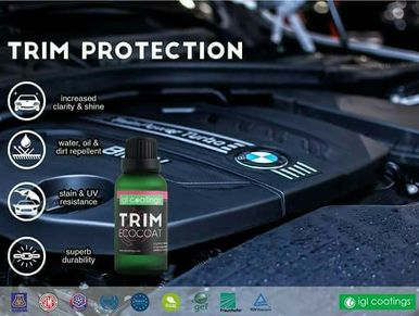 Ecocoat trim is the most technologically advanced product to protect your trim, rubber, and plastic parts. It is highly reactive coating that instantly forms a chemical bond on a molecular basis with the surface it is applied to, and form a hardness of 6H that rejuvenates, darkens and protects the trim from fading.
